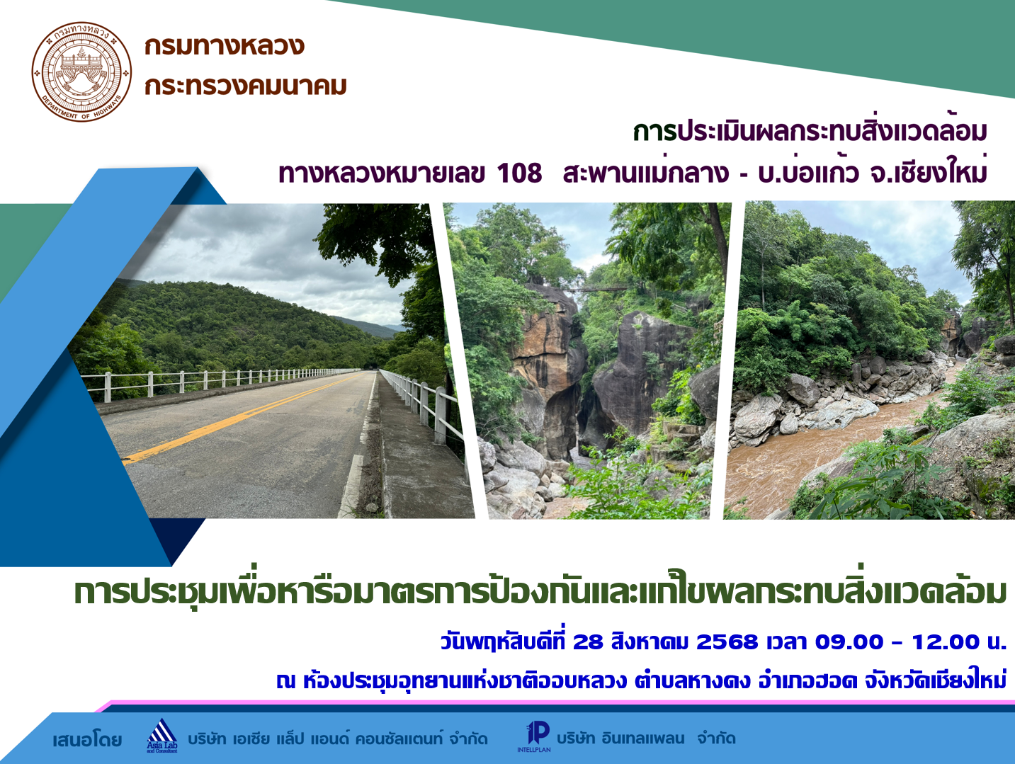 กรมทางหลวงร่วมกับกลุ่มบริษัทที่ปรึกษา ประกอบด้วย บริษัท เอเซีย แล็ป แอนด์ คอนซัลแตนท์ จำกัด และบริษัท อินเทล แพลน จำกัด ได้ดำเนินการจัดการประชุมเพื่อหารือมาตรการป้องกันและแก้ไขผลกระทบสิ่งแวดล้อม การประเมินผลกระทบสิ่งแวดล้อม ทางหลวงหมายเลข 108 สะพานแม่กลาง - บ.บ่อแก้ว จ.เชียงใหม่ โดยมีวัตถุประสงค์เพื่อนำเสนอความก้าวหน้าของการศึกษาด้านต่าง ๆ รวมถึงผลกระทบสิ่งแวดล้อม และร่างมาตรการป้องกันและแก้ไขผลกระทบสิ่งแวดล้อม พร้อมรับฟังความคิดเห็น ข้อเสนอแนะ และความต้องการของกลุ่มเป้าหมายที่เกี่ยวข้อง เพื่อนำไปพิจารณาประกอบการศึกษา เมื่อวันพฤหัสบดีที่ 28 สิงหาคม 2568 เวลา 09.00–12.00 น. ณ ห้องประชุมอุทยานแห่งชาติออบหลวง ตำบลหางดง อำเภอฮอด จังหวัดเชียงใหม่ โดยได้รับเกียรติจากนายฉัตรเทพ เพิ่มทรัพย์ ปลัดอาวุโสอำเภอฮอด เป็นประธานเปิดการประชุม ผู้เข้าร่วมประชุม ประกอบด้วย ผู้ได้รับผลกระทบ ผู้นำชุมชน ประชาชนที่อาศัยอยู่ในพื้นที่ศึกษาโครงการ หน่วยงานราชการในระดับต่าง ๆ องค์กรเอกชนด้านการคุ้มครองสิ่งแวดล้อมและอนุรักษ์ทรัพยากรธรรมชาติ องค์กรพัฒนาเอกชน สถาบันการศึกษา นักวิชาการอิสระ สื่อมวลชน และประชาชนทั่วไป รวมทั้งสิ้นจำนวน 82 ราย
